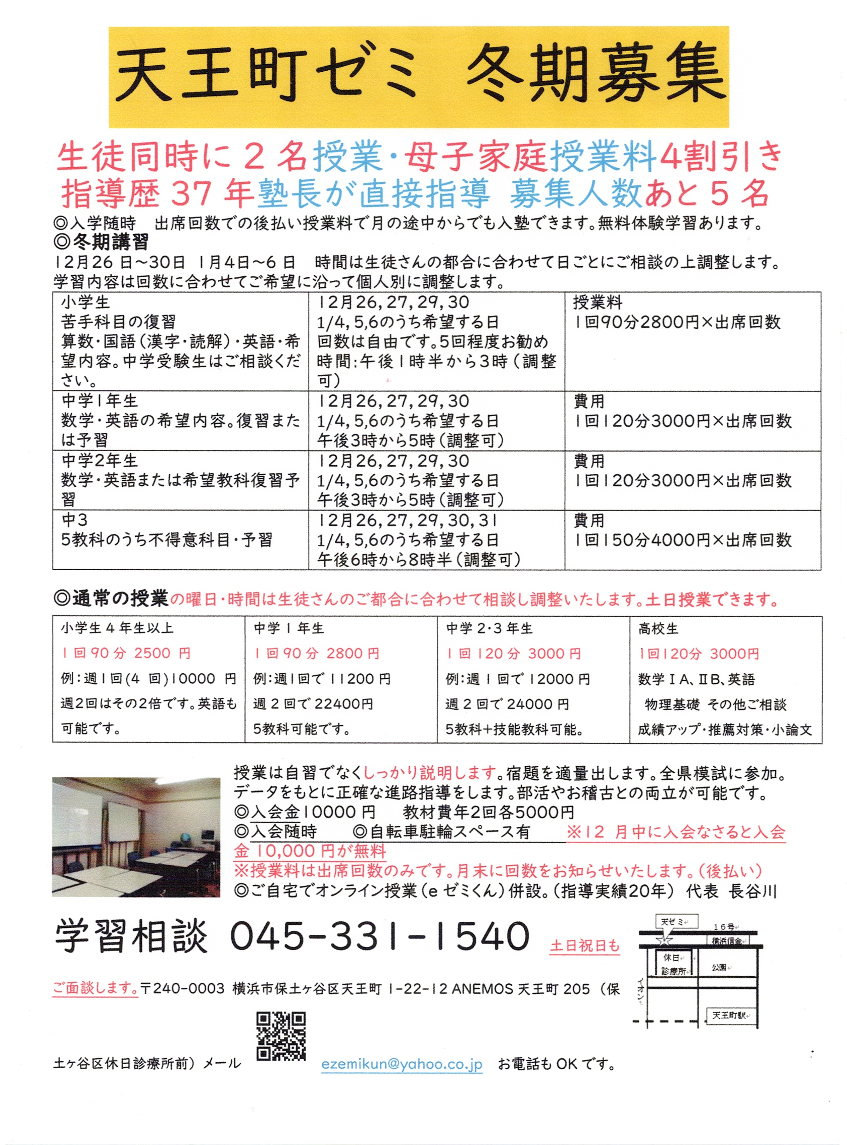 | 通常授業 ◎無料体験学習 小学生〜高校生 ◎入学随時 ◎個別学習相談 随時受付中です。 ◎低学費(例:中1月4回で11200円。週2回では22400円。出席回数計算です。) ◎2025年12月中までに入会すると入会金無料 ◎お好きな曜日時間で通えます。土日授業できます。 ◎全県模試(塾内受験)で的確な進路指導ができます。 電話 045-331-1540 mail ezemikun@yahoo.co.jp |